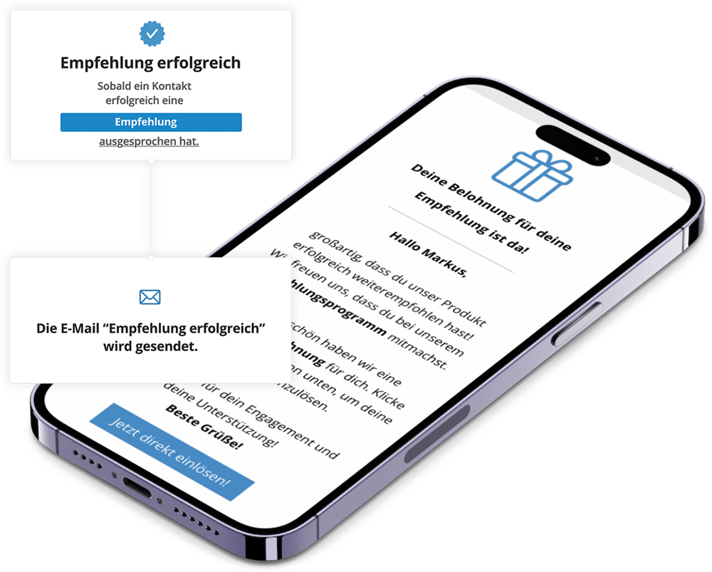 Mit 4leads kannst du den gesamten Prozess automatisieren. Sobald eine Empfehlung erfolgreich war, schickt das System direkt eine E-Mail mit dem Bonus an den Kunden heraus.