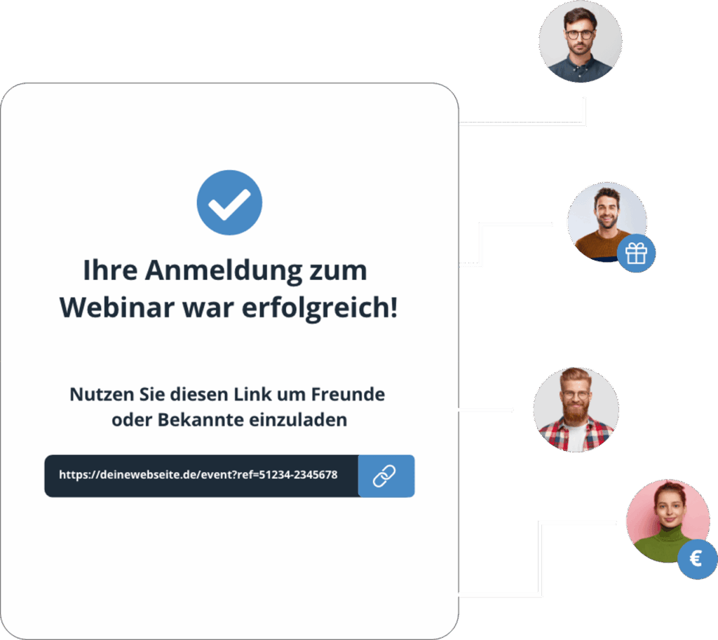Unsere Software generiert den angemeldeten Teilnehmern automatisch einen persönlichen Link, der auf der Danke-Seite zur Verfügung gestellt wird und mit dem sie Freunde oder Bekannte ebenfalls zum Webinar einladen können.