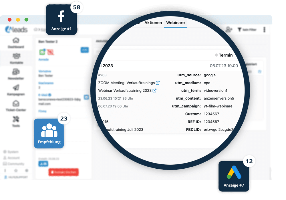 Um dein Marketing so effizient wie möglich zu gestalten, musst du genau wissen, welcher Teilnehmer über welche Ad, Empfehlung oder andere Quelle auf dich aufmerksam wurde. Und das bietet dir unsere Software.